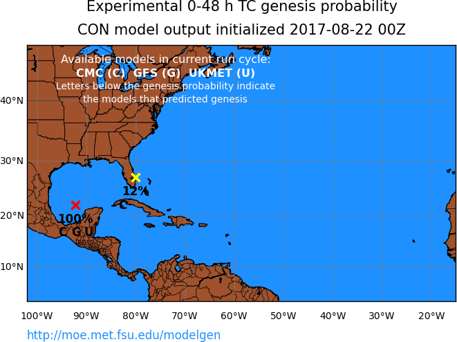 Florida State University Experimental TC Genesis Probabilities (Consensus) suggest 100% chance a Tropical Cyclone will form in the Western Gulf.