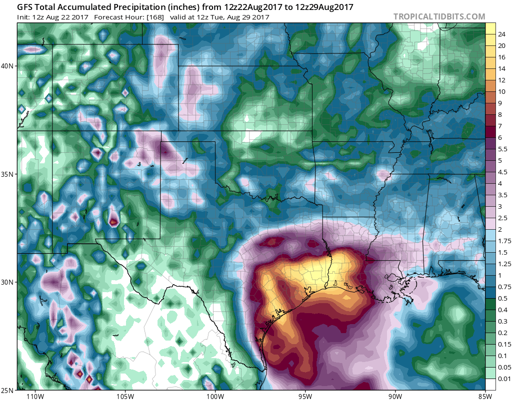 SSTs will increase to 30°C (86°F) as ex-Harvey moves to the northwest towards Texas this week. The wind shear will stay light, and the atmosphere will remain moist. These conditions should allow ex-Harvey to regenerate into at least a tropical storm before it makes landfall on Friday, and it may be able to reach hurricane strength. The 0Z Tuesday operational runs of our three reliable global models for predicting tropical cyclone genesis—the GFS, European and UKMET models—all developed the system would develop into a tropical storm or hurricane, and all of these models showed a landfall between the Mexico/Texas border and the central coast of Texas on Friday. The NOAA jet is flying a dropsonde mission over the Gulf of Mexico on Tuesday evening to help the models make good forecasts for their 0Z Wednesday runs. In its tropical weather outlook issued at 8 am EDT Tuesday, the National Hurricane Center gave ex-Harvey 2-day and 5-day odds of development of 70% and 90%, respectively. Regardless of development, coastal Texas can expect heavy rains in excess of five inches late this week.