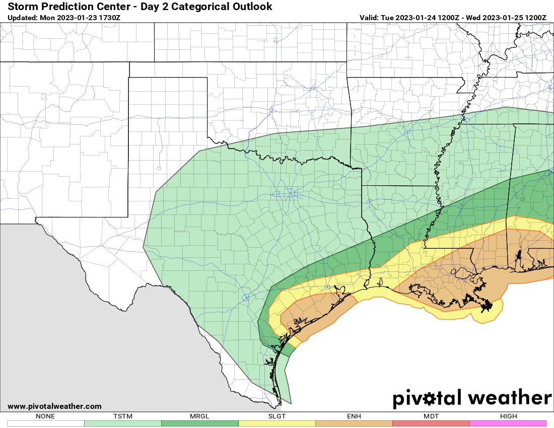 SPC has upgraded the coastal counties to a slightl risk. With an area wide slight risk for flash flooding tomorrow. The main there for most is still localized street flooding. But there is also a conditional risk for discreet supercells especially in the coastal counties.