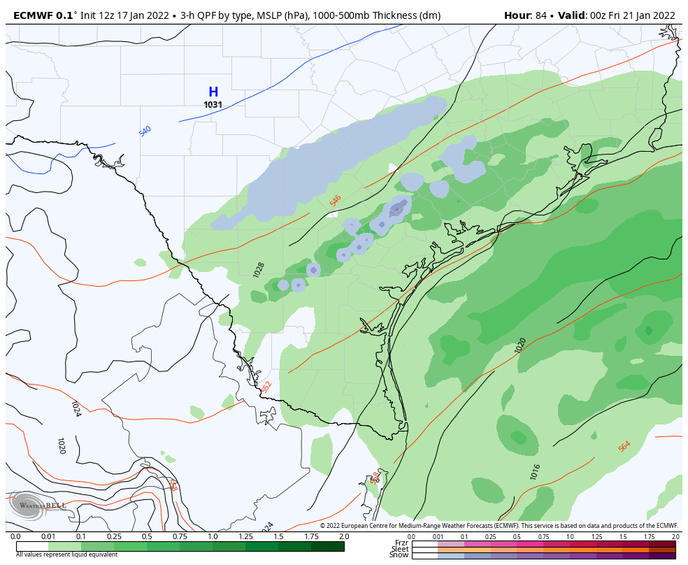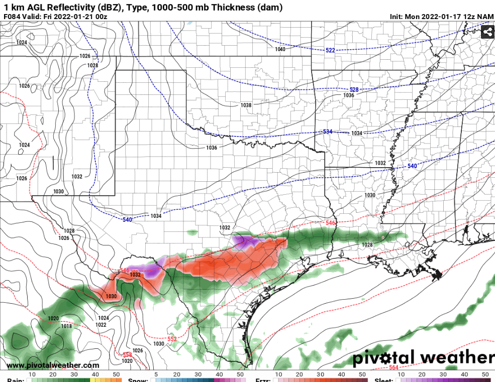 TexasBreeze wrote: Mon Jan 17, 2022 11:00 am Even in the gfs the wet bulb temp is so close that a couple degrees cooler and the precip could cool to the dew point creating more sleet at the onset of precip. Snow isn't likely due to a stout warm nose above and heavier precip would tend to warm up the air.