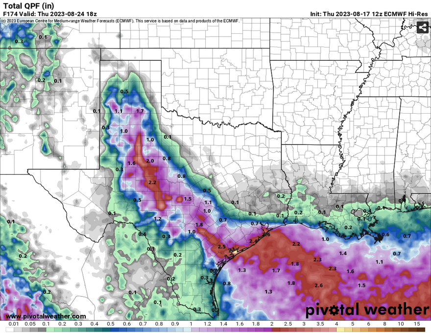 One thing I've noticed is that the EURO has been pretty consistent that whatever form this feature ends up taking it will be able to bring rain far inland.At least along a localized corridor wherever the low ends up tracking.Stratton20 wrote: ↑Thu Aug 17, 2023 1:52 pm Euro coming in with a slighty more organized system around matagorda bay, it still favors the consolidation of the N. part of the wave, based on the convection right now favoring the N. Part of the wave, im starting to buy more into the euro solution , i think the GFS and CMC will cave to the euro eventually, really nothing is going on with the southern part of the wave