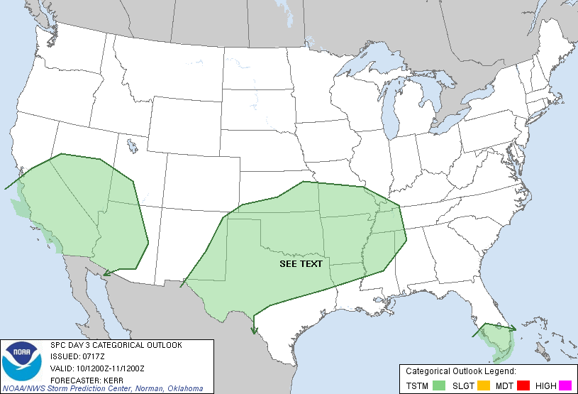 After a couple of cool days, a warming trend is set to begin as a return flow off the Gulf becomes established. A potent fall storm system will begin to meander E across California/Great Basin and slowly trek E toward the Southern Plains. While best the dynamics appear to be further N into the Texas Panhandle/N Texas/Oklahoma area during the mid to late week time frame, the guidance is suggesting some potential for strong to severe storms as a Pacific cool front drops S into Central Texas on Friday into Saturday and the robust upper low ejects into the Southern Plains. The SPC has a ‘see text’ area outline for portions of N Texas/Oklahoma in the day 3 time frame for potential super cell development. After several days of a strong return flow off the Gulf and increasing moisture and developing low level jet as well as a rather impressive tap of EPAC moisture along with a developing split flow, conditions may develop for a fall severe weather episode as we head toward the end of the week. We will see.