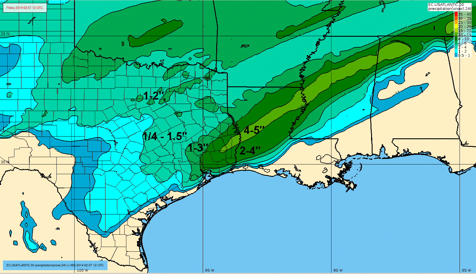 The 00Z Euro has 2-4" of snow for SE TX next Thursday/Friday (1-3" in Houston). Don't hold your breath, though. I'm sure the snow area will change in future runs. I don't expect the models to have a good handle on things until around Tuesday.