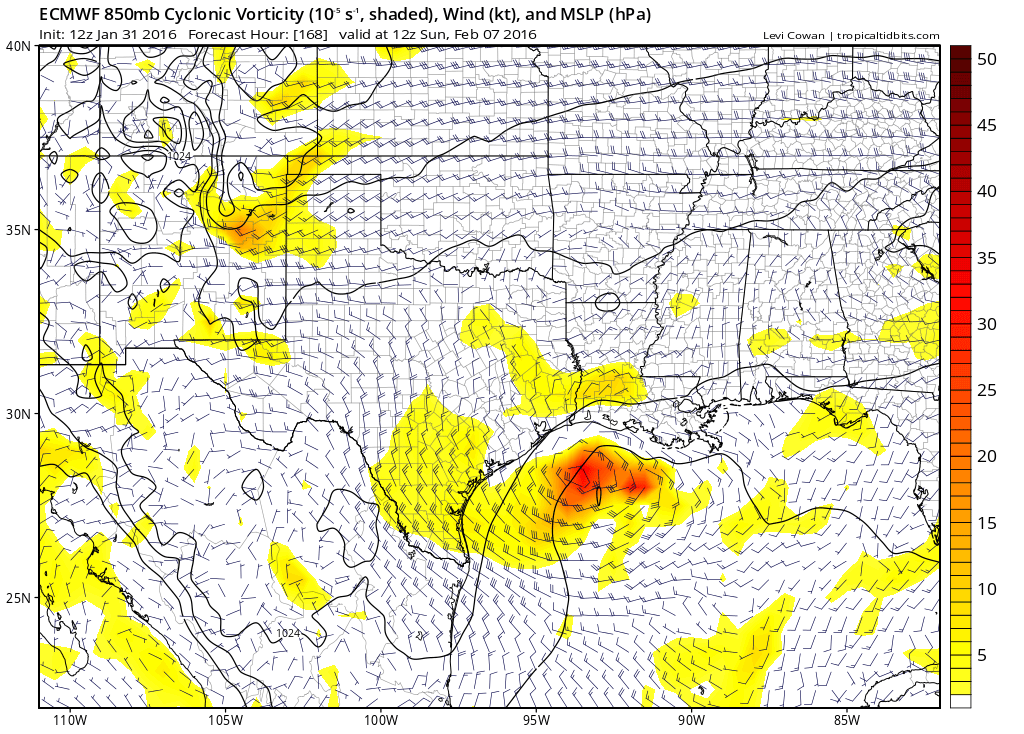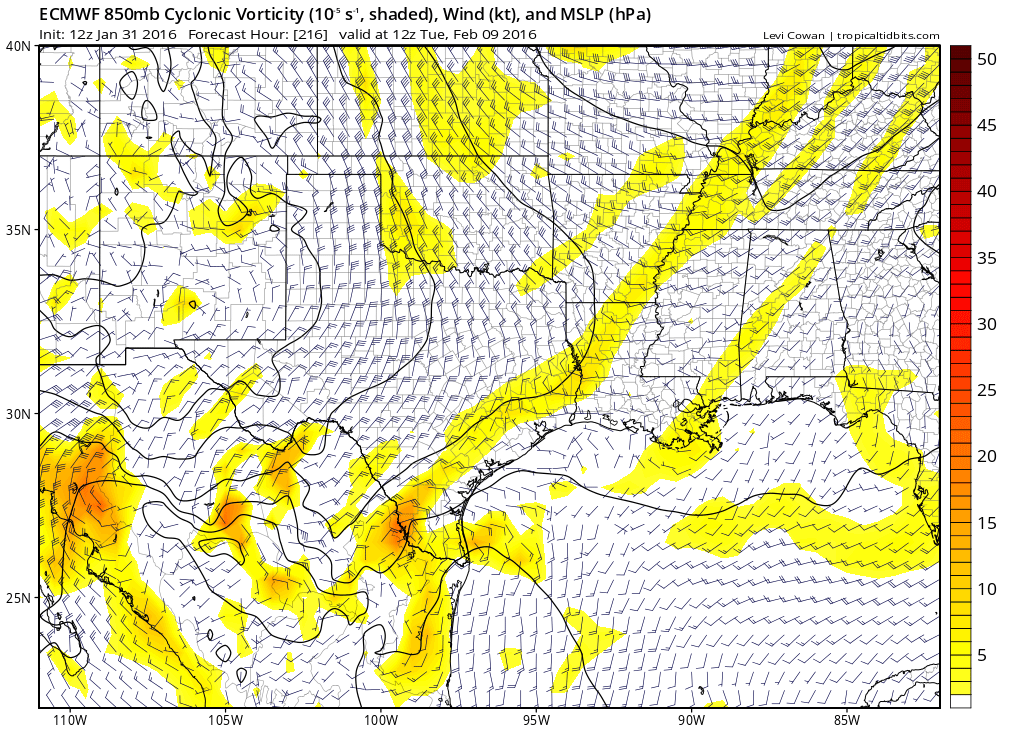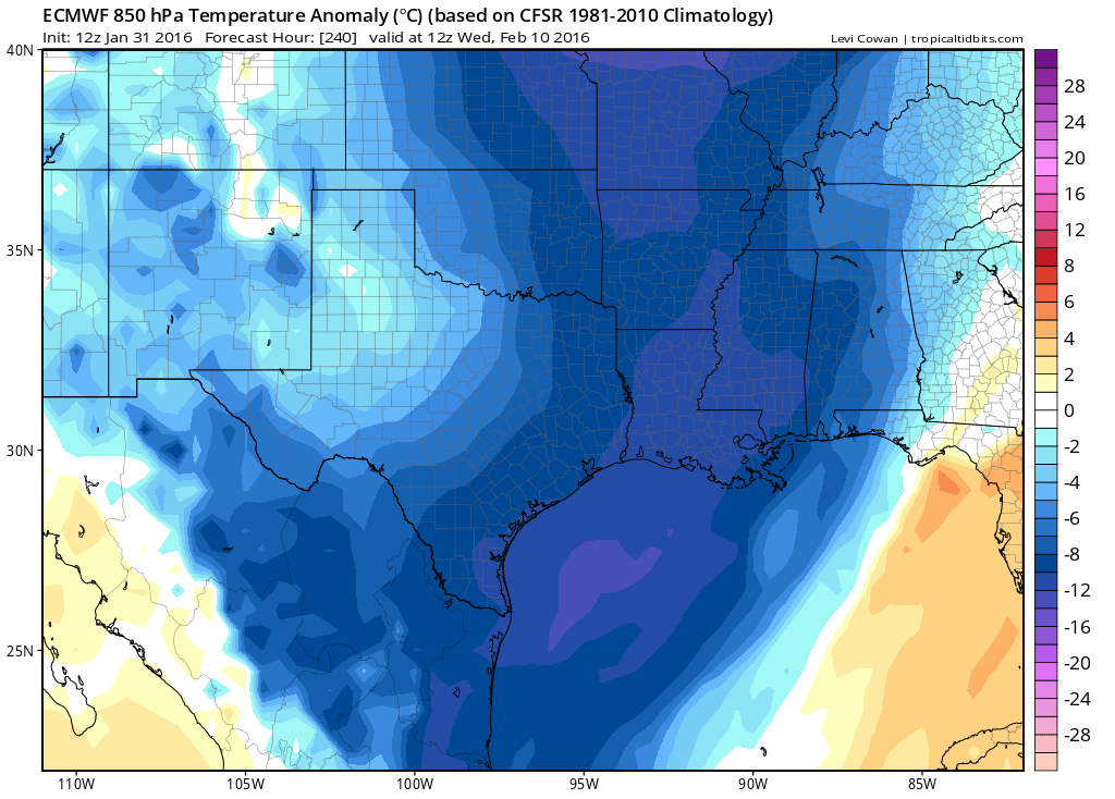The 12Z Euro and Canadian models are completely opposite of the 12Z GFS. The Euro particularly raises an eyebrow when looking ahead to next weekend. We know that a strong Canadian front will sweep across the Lone Star State on Tuesday with much chillier temperatures late next week. The Euro suggests two cold upper air disturbances passing over our Region after the cold air is in place. Typically in early February IF we can get a shortwave or two passing over cold air at the surface, interesting things can develop. Looks like a long week of watching the various computer schemes to see if this is a mirage or a real potential.