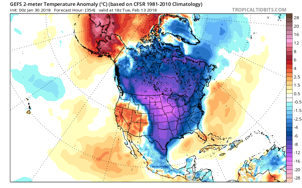 Yeah, good point above. The cold air is not showing up on the GFS right now and it goes out to Feb. 14th.