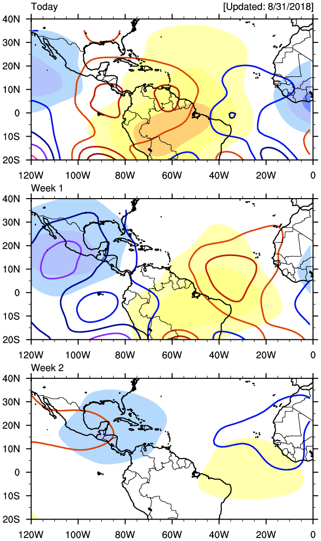 Regarding that area of disturbed weather over Hispaniola, upper level wind shear associated with a small upper low/trough just East of Jacksonville/Savannah continues to keep that disturbance in check at this time and should throughout the Holiday Weekend. Conditions may become slightly more favorable as the Tropical Wave axis enters the SE Gulf on Labor Day. The overnight ECMWF did suggest a weak disturbance would ride the Northern Gulf Coastal areas and slowly attempt to organize off the Middle/Lower Texas Coast. The GFS never develops this disturbance, but just enhances rainfall chances. Interestingly, the models do indicate a somewhat small, but possibly conducive Convectively Couple Kelvin Wave for next week that did not show up in any of the guidance a couple of days ago. That could assist in thunderstorm development over the Gulf with its rising air, so we will continue to monitor over the Holiday Weekend as should everyone to be on the safe side should any tropical mischief decide to spin up next week in our backyard.Tropical Weather Outlook
