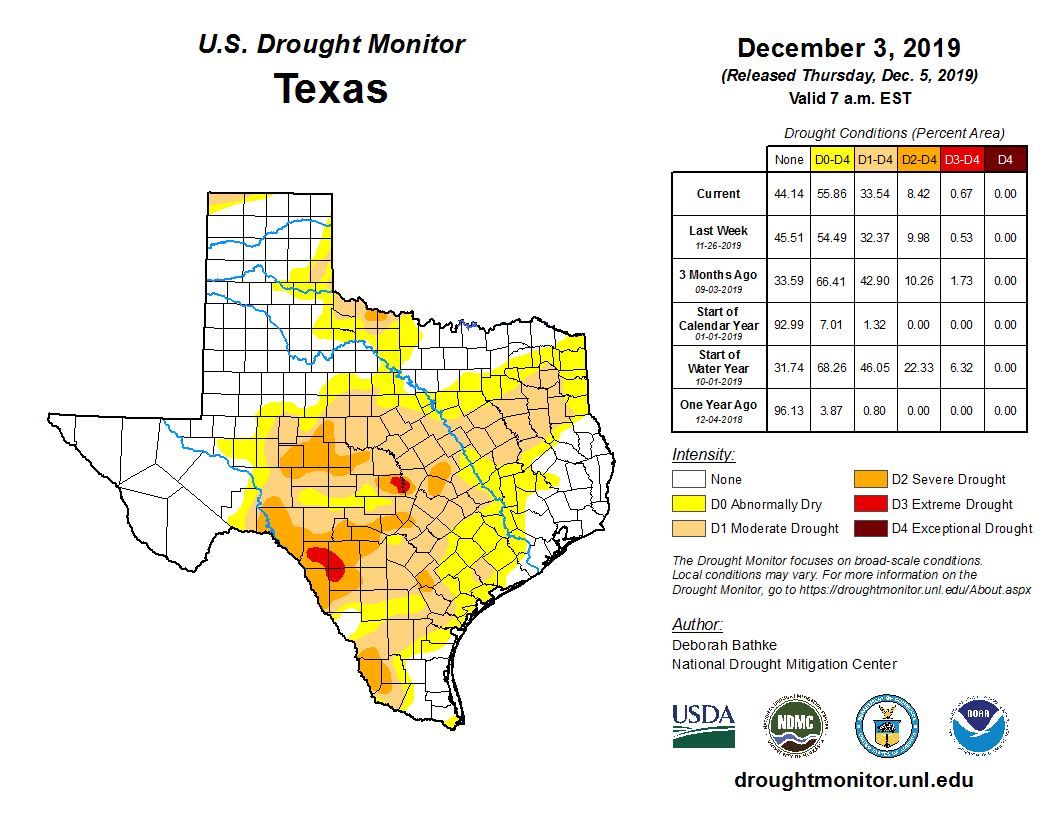 Drought conditions have expanded in the last month with a general lack of rainfall especially across central and southwest Texas. Extended range outlooks suggest below normal rainfall over the next 3 months over southern Texas which will likely worsen ongoing drought conditions.