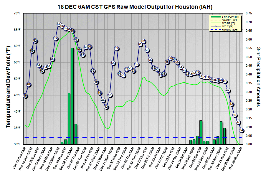 Looks like some snow in the northern TX and OK panhandles on Monday. No significant cold here through Christmas. A bit better model agreement for next weekend. Lows in the 40s, highs in the 50s for Christmas.