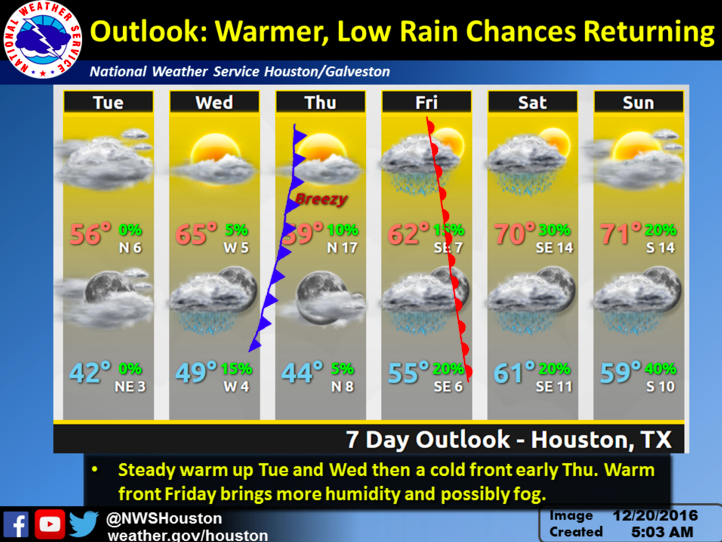 Gradual warming through Christmas weekend with low rain chances Wednesday through Christmas Day. Perhaps low 70s for Christmas weekend across SE TX. Temps currently in the 30s and low 40s.