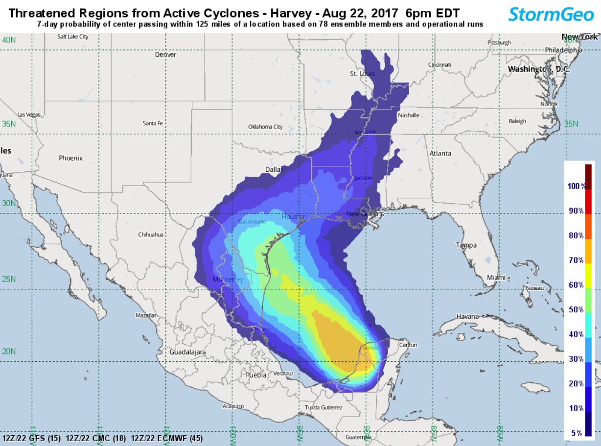 Our latest ensembles-based #TRAC guidance indicates a high chance of a lower to middle TX coast hit from #Harvey. Very heavy rain potential.
