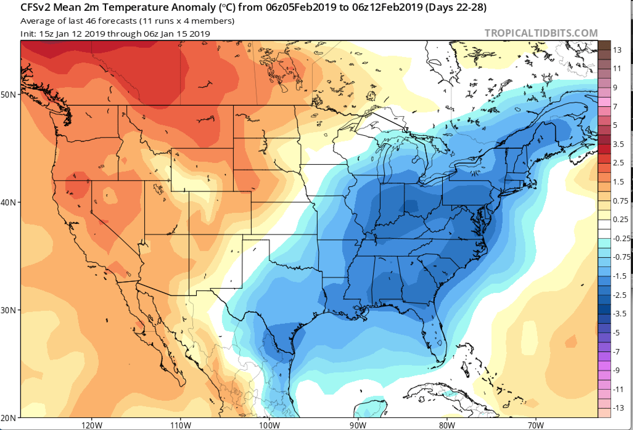 Cpv17 wrote: Tue Jan 15, 2019 1:46 pm This is what I meant earlier by saying towards the end of the month the coldest anomalies are aimed more towards Texas, rather than the east/southeast. This is what you want to see.