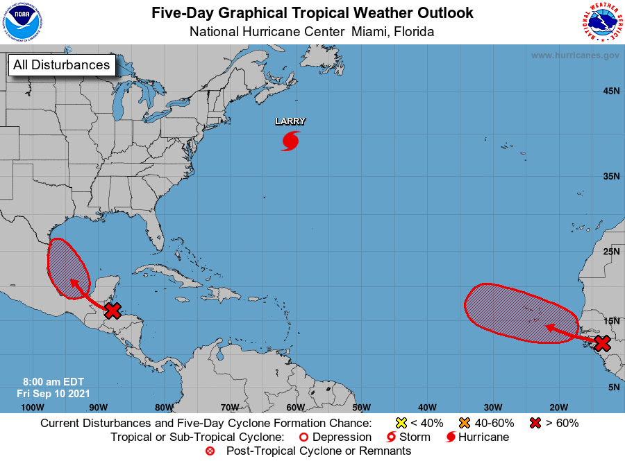 Though, their summary is a little more telling - "tropical depression". The chance would be based on any classification, even minimal. Environment doesn't look all that favorable as it nears the coast; potential to wrap in dry air and it may encounter more wind shear as it gains latitude. But, of course, that's not set in stone.Scott747 wrote: ↑Fri Sep 10, 2021 1:05 am The models aren't that supportive (ensembles mildly so) but the NHC sure is bullish. Now up to 60% and the highlighted area keeps moving up the coast with parts of the lower texas coast now in the TWO 'cone.'