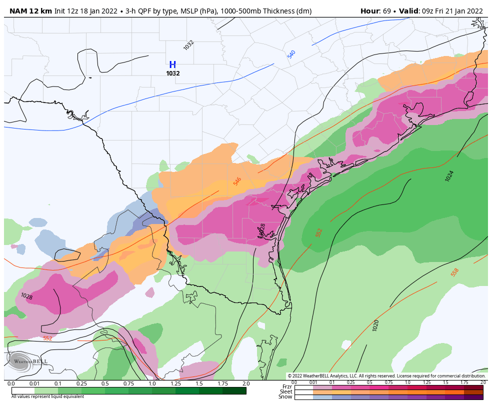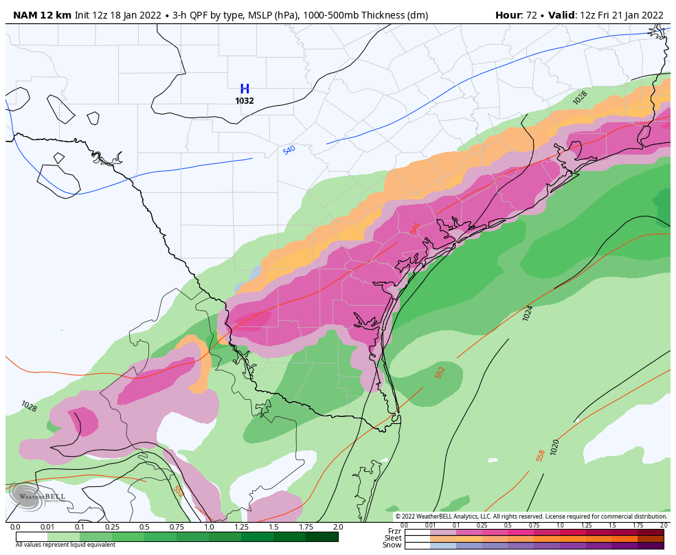 You have to look at the model soundings to see the precip type.You cant take the output you see on the maps as verbatim (due to the low resolution).A lot of the rain you see the model showing based on soundings would actually be sleet over the metro late Thursday night into Friday morning.As a subfreezing pocket of air forms above the surface.Stratton20 wrote: ↑Mon Jan 17, 2022 10:40 pm Note this includes sleet but the GFS has widespread accumulations, which is odd because it only shows a small pocket of sleet in houston