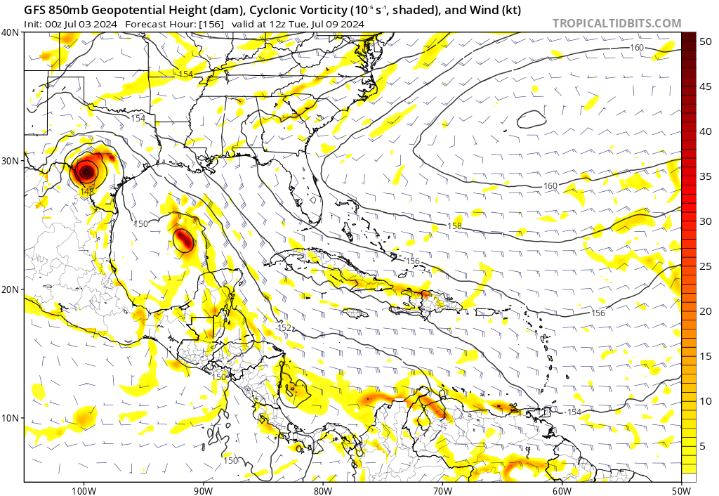 Only about a 600 mile difference between the Euro and ICONStratton20 wrote: ↑Wed Jul 03, 2024 12:35 am Euro goes into just north of tampico but has a weaker shstem approaching the yucatan which is why its further south, around 993 mb, i am not sure about this, i think some guidance is really over doing this thing weakening