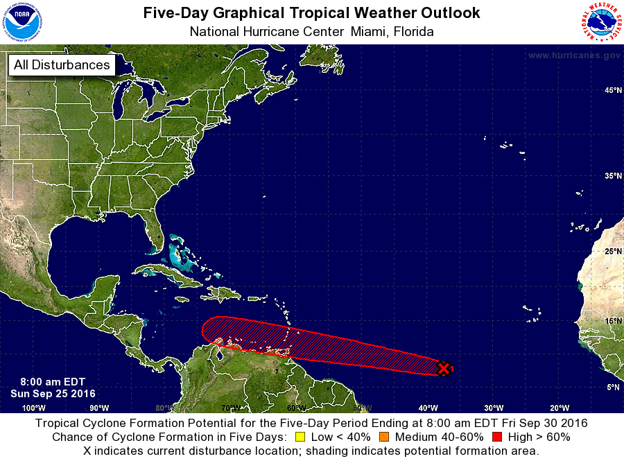 A large and well defined tropical wave just east of the Windward Islands this morning is moving westward at 15-20mph. USAF mission yesterday afternoon was not able to find a closed low pressure center and a new mission is in progress at this time to determine is the strong wave axis has closed off a surface center. Satellite images show decent to well defined banding features across the northern part of the wave axis with deep convection this morning near a possible center. Upper level conditions are currently favorable for development, but wind shear does greatly increase across the Caribbean Sea just west of the wave. This wave will bring near tropical storm force winds and heavy rainfall to the Windward Islands later today.
