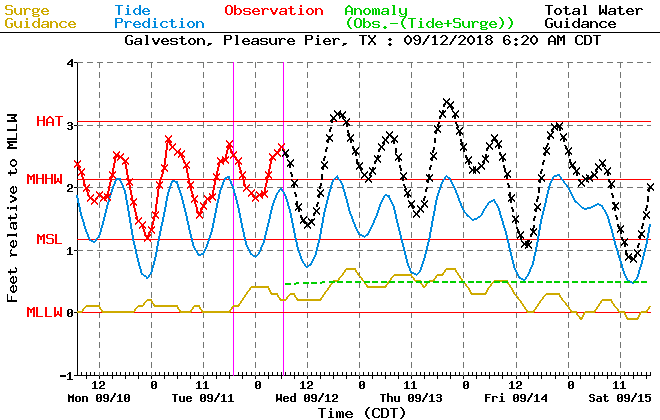 ides will begin to increase due to increasing wind and seas later today and remain elevated into Thursday and Friday. ET surge guidance is showing total water level along the coast of around 2.5-3.0 feet above MLLW at times of high tide on Thursday and Friday. This may cause some minor coastal flooding concerns along Bolivar, but is generally below the 4.5-5.0 feet thresholds which have historically caused bigger issues along the upper TX coast.