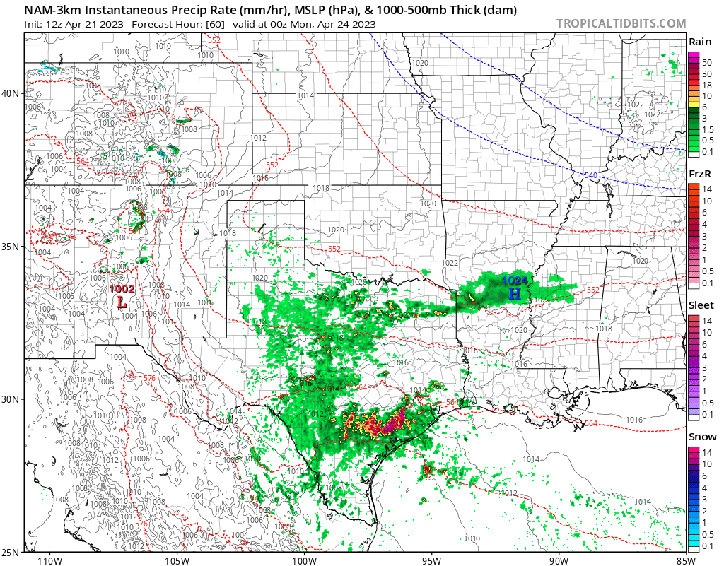 A MCS will be moving into the Corpus area tomorrow.The HRRR shows a decent chance of light to moderate showers especially for areas south of I-10.As the northern 1/3rd of the MCS clips the southwestern portions of SE Texas.While saying that the NAM for a few runs now continues to show more of a washout tomorrow with the MCS taking a more northern route into the coastal bend/SE Texas.Such a scenario would lead to heavier rain and thunderstorms instead of showers. We'll see tomorrow which model ends up being more accurate.0Z NAM vs 0Z HRRRbrazoriatx wrote: ↑Sat Apr 22, 2023 7:51 pm What's the chances for rain tomorrow? I gotta move out of my apt and I'll be hauling furniture in the back of a truck![]()