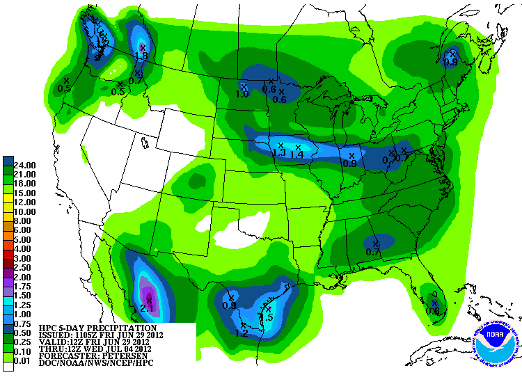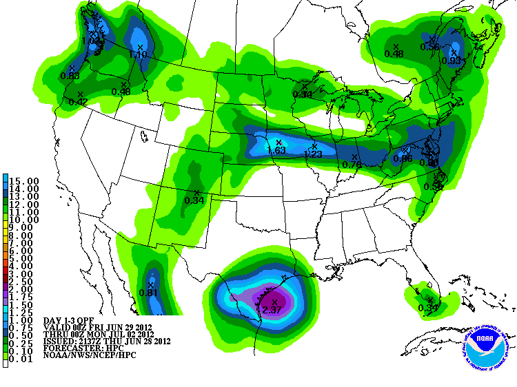 The mammoth upper level ridge will begin to break down and back off to the north and west starting Thursday and this will allow afternoon temperatures across the coastal areas of TX to fall back into the upper 90’s. Inverted trough/upper level low off the TX coast will begin to retrograde (move westward) into the coast and then inland on Friday and this feature will help to moisten a fairly dry air mass. Combination of increasing moisture, cooler convective/trigger temperatures in the lower 90’s and a more favorable seabreeze setup will support at least a chance of rainfall this weekend (20-40%). Best chances will be south of HWY 105 where moisture will be the greatest, the seabreeze will serve as a focus, and the influence of the central US high will be weakest. Increased moisture, rain chances, and cloud cover will help return temperatures to near normal for late June (low to mid 90’s) helping to end the current heat wave. Hopefully we will see some rainfall to help wet the ground not allowing the ridge to strongly re-establish over the region early next week. The ridge will not back off over N TX during this period and that is of some concern as soil moisture will continue to decline and the intense heat will help build on itself (helping to pump up the ridge and keep it locked in place…much like last summer.)