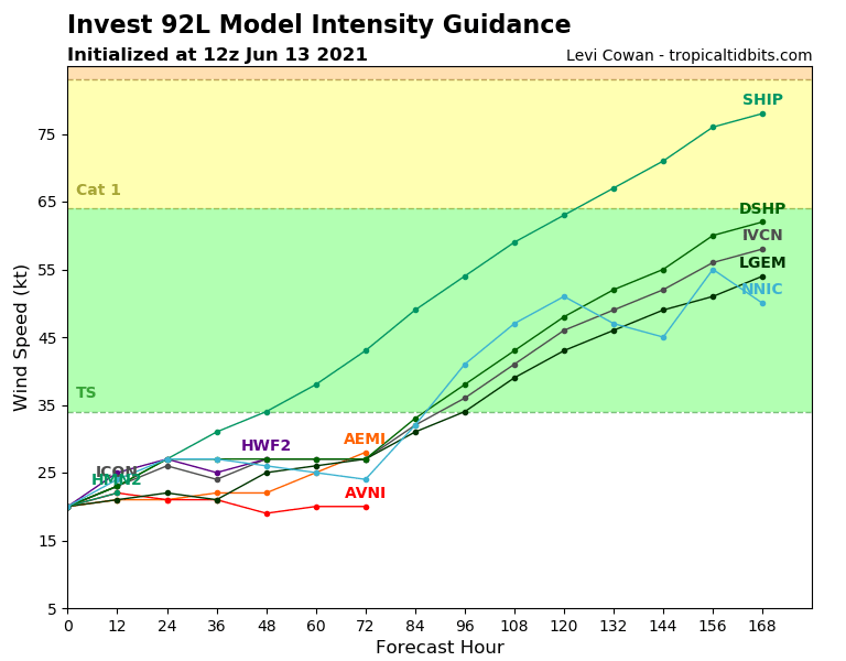don wrote: Sun Jun 13, 2021 9:02 am 12Z intensity models. I would like to see the global models get onboard though, before i buy into these intensity models showing a strong tropical storm.