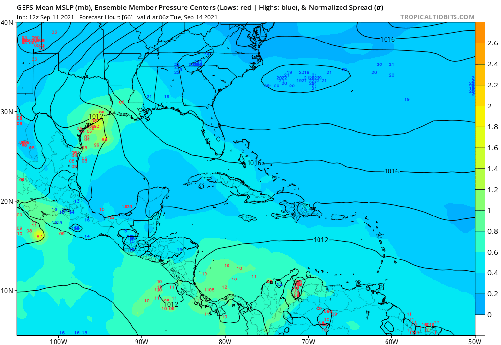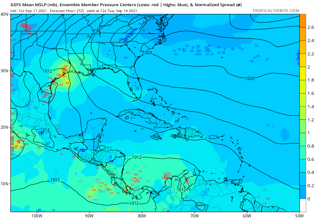 I’m just saying at the moment there is nothing to suggest the GFS is performing “poorly” with the system. It is stronger, but the center remains just a bit further offshore. NAVGEM (though not the best model) also has this solution. Let’s not forget which model has been the most excited about development over the past week (GFS). There is also some historical precedent for a coast-rider, looking at the setup. Some ensemble members from other models also suggest it is *possible.Stratton20 wrote: ↑Sat Sep 11, 2021 11:35 am weatherguy425 no i mean strong as in strength, the GFS is by far the most “aggressive “ in terms of this systems strength, most model guidance is keeping this weaker and takes it into Texas and not riding it up the coast, for now this remains the more likely solution, the gfs solution is an outlier, im not buying into this unless the Euro changes