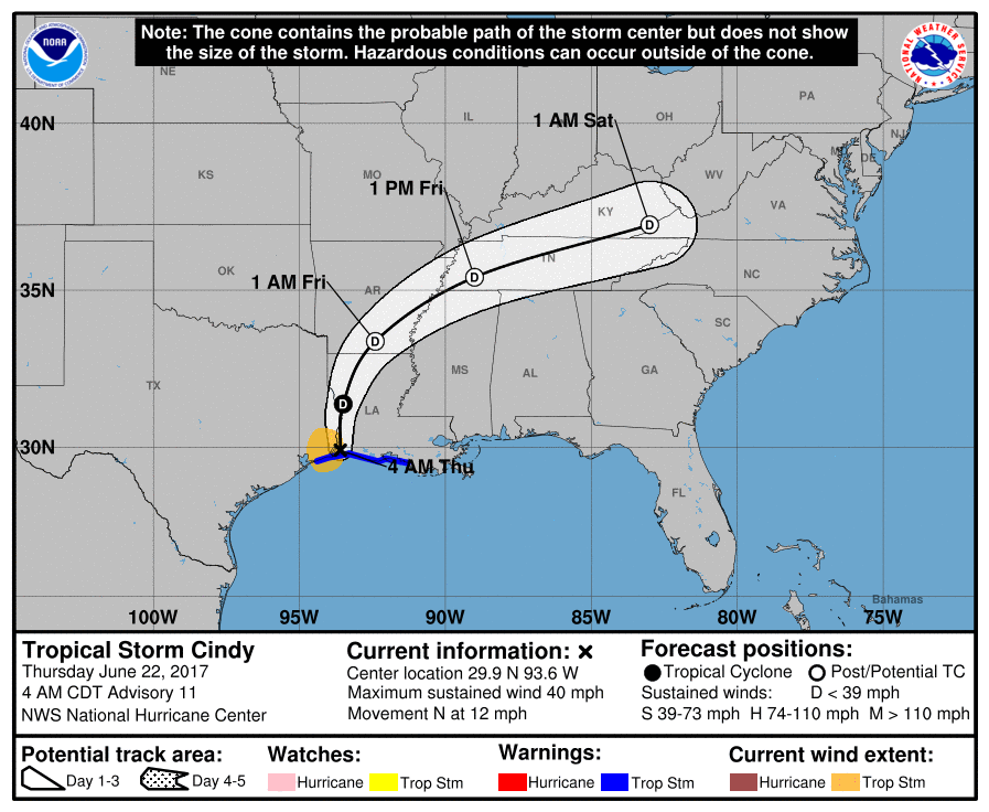 Looks like Cindy is finally ready to come ashore (and looks like it will be just barely on the Louisiana side of the Texas/Louisiana border.