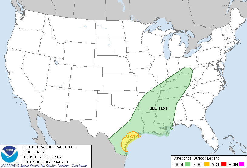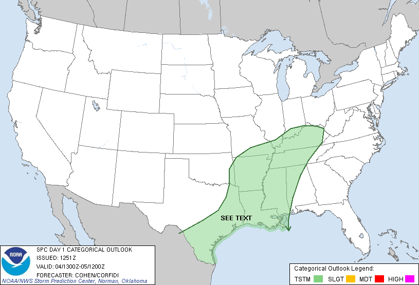 The SPC has SE TX/SW LA outline for isolated severe potential later this afternoon/tonight as a short wave and attented Pacific front sag into Central/SE/E TX/Western Louisiana.