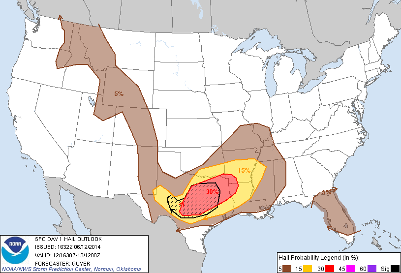 I will not be surprised to see a Moderate Risk Upgrade from the Storm Prediction Center at 1730Z today across portions of the Hill County/E/SE Texas (N of I-10) extending E into Louisiana. As Jeff mentioned, we need to watch for development later today around Junction into Austin/Waco and possibly College Station on E toward Lufkin and just S of Shreveport.