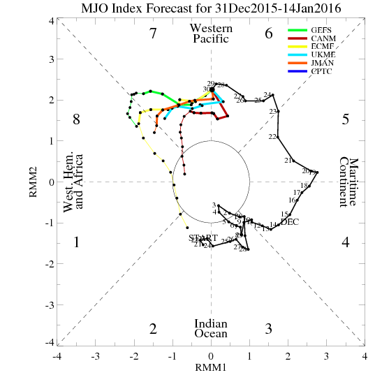 Regarding what we may see the first half of January, the various computer schemes are suggesting a very fast flow across the Southern tier of the United States as we would expect in an El Nino pattern. The sub tropical jet continues to be very noisy with storm systems arriving across our Region every 3 to 4 days with varying strength. The ensembles are beginning to converge on a couple of potential significant storms in the extended range. Keep an eye on the January 7th/8th timeframe and around the 13th/14th for yet another strong storm. The Teleconnection Indices continue to advertise a +PNA/-AO/-EPO/- to neutral WPO as well as a wet phase of the MJO (Phase7/8) which tends to suggest a colder weather pattern along and East of the Continental Divide and a continued unsettled pattern from California across the Desert SW into Northern Mexico and Texas as well as the Dixie States along and near the Northern/NE Gulf Coast into Florida.