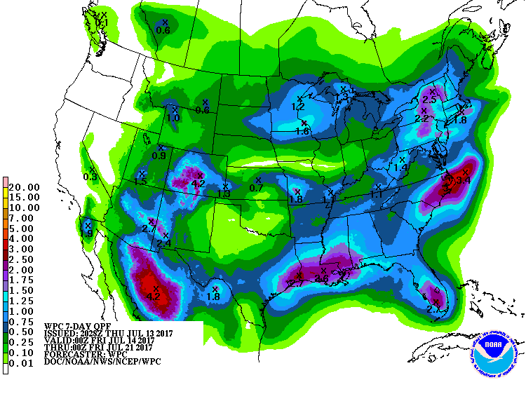 We continue to be in the vicinity of a general weakness between the Western Heat Ridge and the Bermuda Ridge suggesting that the unsettled pattern will remain in place throughout the rest of the work week and into the weekend.