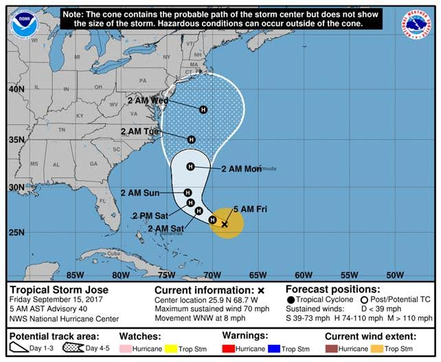 TS Jose continues to loop and meander over the SW Atlantic and should begin to move toward the NW and NNW over the next several days. Latest models have shifted enough westward to suggest Jose may become a threat to portions of the US E/NE coast by the middle of next week.
