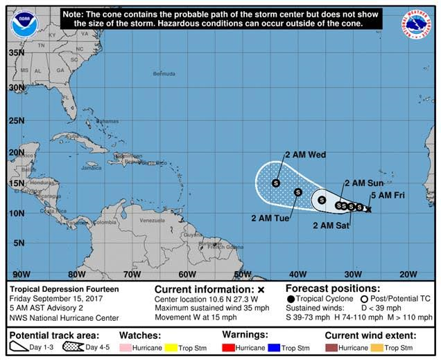 TD # 14 has formed over the far eastern Atlantic Ocean and is moving westward this morning and will likely become a tropical storm later today. This system should not impact any land areas for the next 3 days.