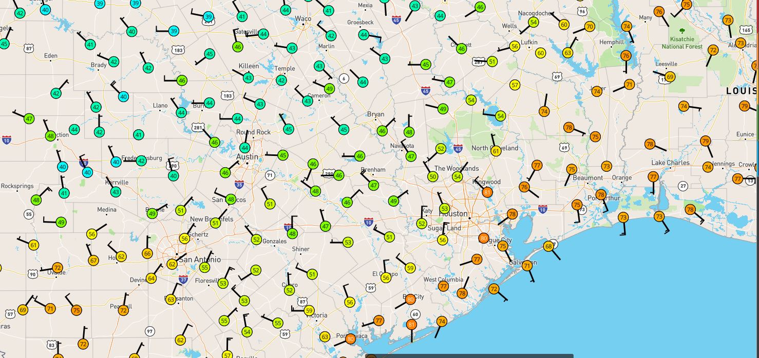 Strong front is located from NE TX to College Station to Austin to Del Rio at 700am and is moving southeastward at 20-30mph. Isolated showers have begun to develop across the region along and ahead of this boundary and this will continue through the rest of the day as the boundary moves across the area. Temperatures will fall 15-25 degrees as the front passes with most locations ahead of the boundary currently in the upper 60’s to low 70’s and then falling into the upper 40’s and low 50’s behind the front. For example Georgetown is currently 43 and LaGrange 70.