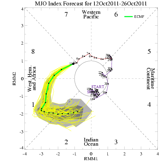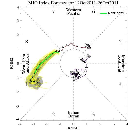 Good to see some received a bit of rainfall last night across the NE and Eastern areas. We were dry up here in NW Harris County. It looks like we are headed back to a dry pattern and fire danger is again in the picture as a cool front swings through bringing an end to the moisture and increasing N to NW winds along with 'cooler' temps the next several days. There is a bit of interesting news for those that follow the MJO. It appears the strongest pulse in many months is heading toward our part of the world. While any tropical activity in Texas remains remote, there are signals that this very robust MJO pulse will lead to activity increasing the Western/Central Caribbean and far Southern Gulf of Mexico. The models are hinting at increased tropical activity in the Bay of Campache/Yucatan region S of the trough/frontal boundary in the days ahead. A rather deep East Coast trough looks to develop and a ridge builds over Northern Mexico. The Pacific is changing to a more active period with an almost zonal flow in the medium to longer range and even hints of a big Upper low off the West Coast and perhaps an active sub tropical jet. We may see a return flow off the Gulf become established next week that might bring rain chances back into the picture. We will see. Now for a bit of off topic news. As you may have noticed, I've been absent a bit over the past month. I've had some pretty major health issues that put me in the hospital a couple of times since mid September. I want to thank jcarr, wxman57, Andrew and Katdaddy for keeping up with things during my time away. I was released yesterday from the hospital from my latest stay and hopefully this chapter is nearing and end. Please know that I am feeling better and will be on the mend for the next several weeks and will be back to my 'old self' in a couple of weeks. Thanks to all that 'knew' what was going on and sent messages of encouragement. I am looking forward to seeing what the fall will bring and will be looking for that first 'true' fall cold front.