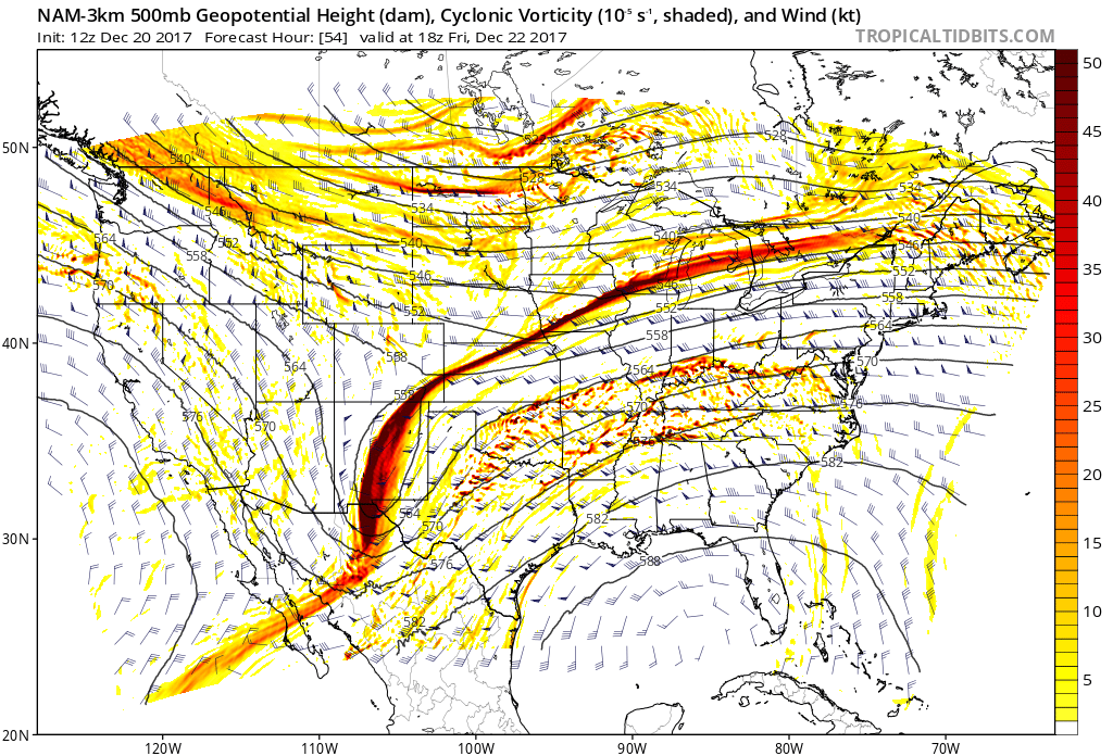 Just took a peak at the shorter range versions of the NAM (32km/12km/3km). Look at the 500mb vorticity charts at hour 54. Those closed 500mb charts look somewhat like what wxman57 posted a week ago when the GFS showed that vort near El Paso and had totally disappeared from the recent week worth of Global models. Remember is never wise to fully trust those model beyond a couple of day particularly in Winter.