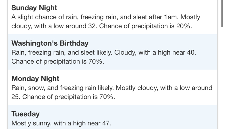 Key message for me from Jeff: “Forecast soundings indicate all precipitation types would be possible (freezing rain, sleet, and snow) at various times during the period as the shallow arctic air mass deepens over the area.” I know the NWS is conservative but their discussion about wintry mix limited to northern and western counties and surface temps “near freezing” baffles me a bit.