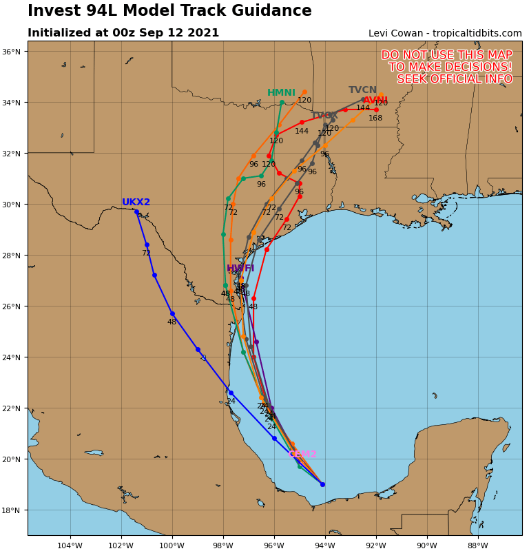 TexasBreeze wrote: Sat Sep 11, 2021 8:20 pm Percentages are now 90/90 and looking at the model tracks shows the most likely track from Matagorda through the se Tx area. Judging from the usual NHC favorite TVCN consensus line. Closely matching the EC model.