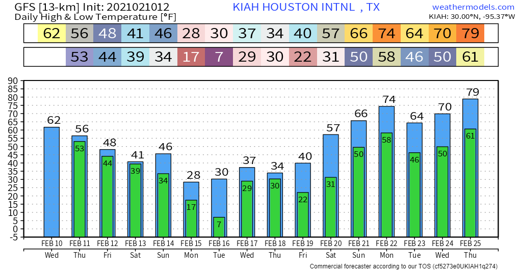 Hah. If our area can't get snow with a setup this good then we aren't getting a chance again.KHOU BLake wrote: ↑Wed Feb 10, 2021 12:54 pm 12z euro is cold with a low of 15 in Houston on Tuesday AM but a high of 37 lol. Keeps everything liquid here. Storm track is further north keeping the warm nose in place. Looks very similar to a few weeks ago when College Station got snow and Houston didn't. Interesting.