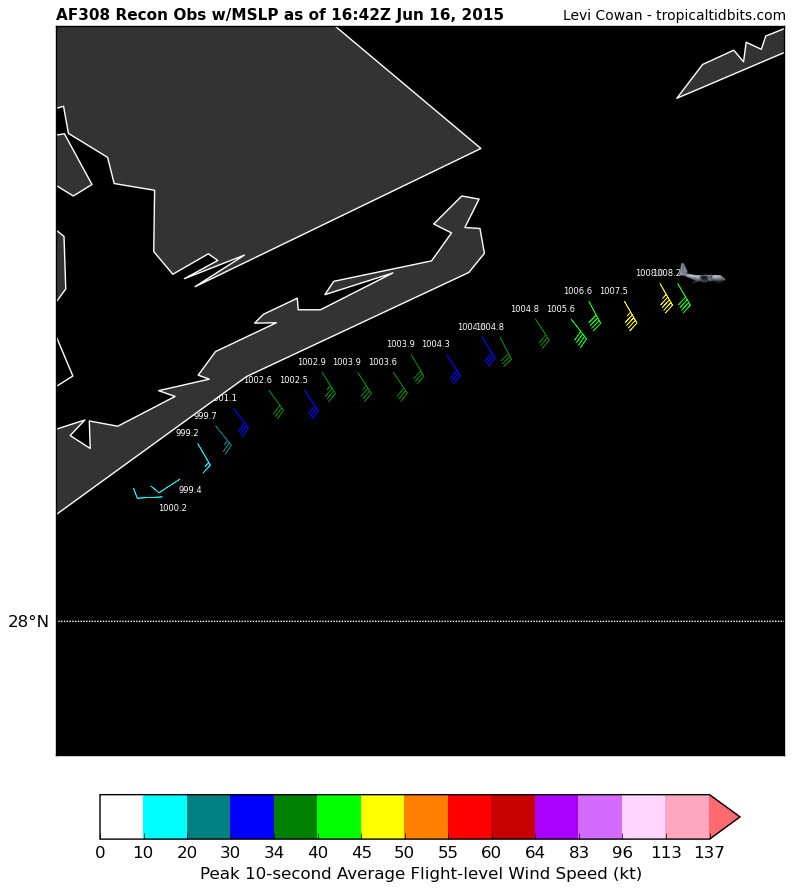 Maximum Flight Level Wind Outbound: 35kts (~ 40.3mph) which was observed 35 nautical miles (40 statute miles) to the SW (215°) from the flight level center at 16:00:30Z