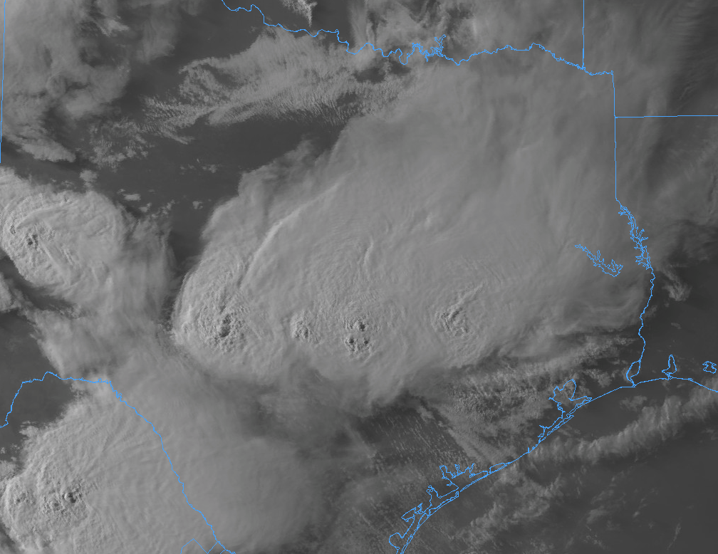 A nice evening satellite image of the storm complex with overshooting tops. Should make for a nice lightning show tonight.