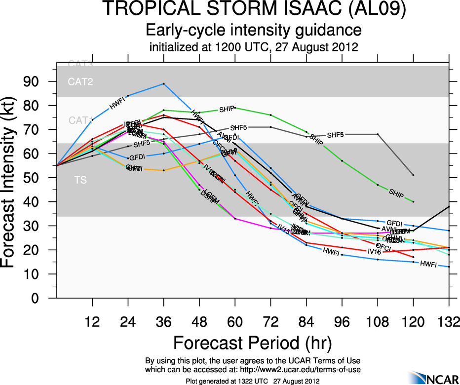 12Z Tracks & Intensity. The 12Z tracks suggest a SE Louisiana cluster with a few further W with a general heading NW after making landfall. The intensity guidance suggest a Cat 1 with only the HWRF suggesting a Cat 2 status.