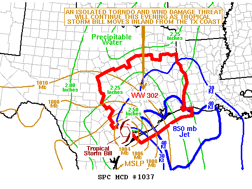Thankfully TS Bill has not produced the heavy widepread flooding rains that have been forecast for past several days across the Houston-Galveston areas. With that said TS Bill is producing heavy rains SW over Matagorda, Wharton, and Lavaca Counties. Decaying tropical cyclones are notorious for nocturnal core rains……Claudette 1979 and Allison 2001 just to name a few. Very heavy tropical rains could develop overnight but this afternoon's Houston-Galveston AFD indicates the most significant flood threat to be W of a Angleton - College Station line. Bottom line, the threat for heavy rains will exist for SE TX until the associated moisture from TS Bill lifts further into the state which should occur later tomorrow afternoon.
