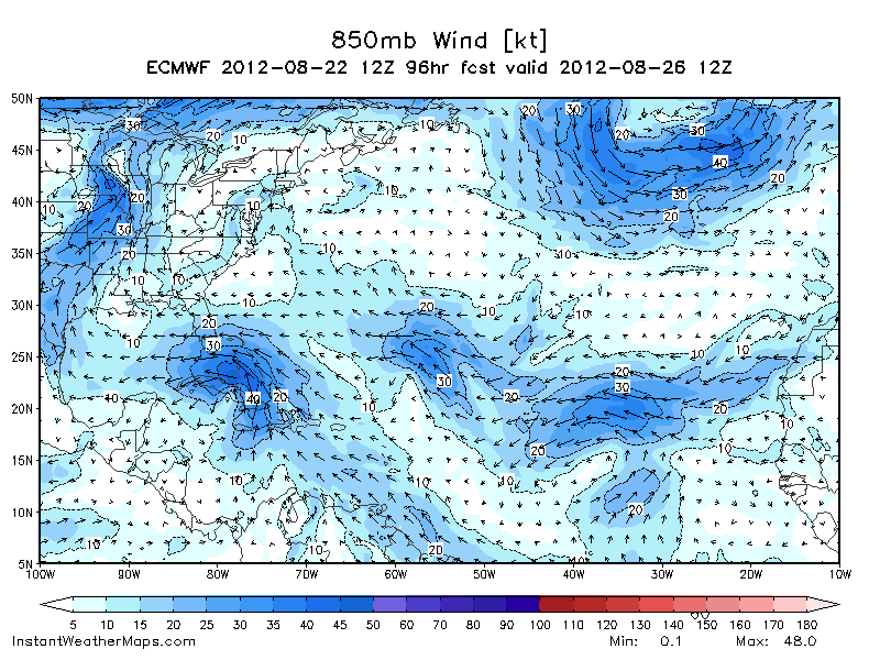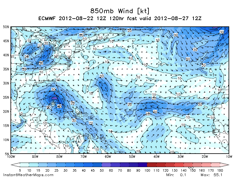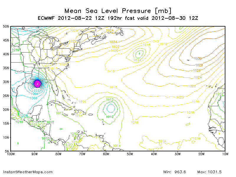 What are Sat loops telling you other than we have a very weak system with a possible center relocation to the south? Both would indicate a further south and west trend at least in the short term. Long term it's looking like more uncertainty with a possible collapse in the steering currents. There could very well be *just enough* ridging across the SE US, as indicated by the Euro, to steer this on a more westerly drift once in the GOM.biggerbyte wrote:Looking at sat. views today, I don't see how anything tropical can make landfall west of NOLA. Of course, said conditions are subject to change as Isaac draws near. If he were three days out from landfall as of this moment, I'd put him well South, or well East of Houston. Let's see what Thursday looks like.