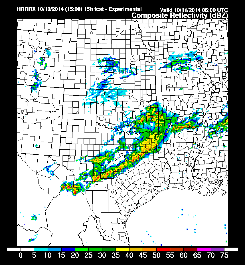 The latest HRRR (High Resolution Rapid Refresh) guidance suggests the front will be NW of SE Texas in the early morning hours of Saturday.SLM87TX wrote:I seen they are mentioning that the line might be moving a little faster and be farther south. Wonder if we will see any of the severe weather tonight?