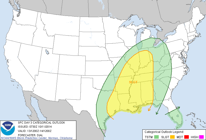 The new Day 3 Severe Outlook from the Storm Prediction Center suggests the greatest threat for severe weather on Monday will be NE of Texas in the Mid Mississippi River Valley Region. That does not mean there is zero chance of severe storms across all of SE Texas. This is likely to be a quick moving mid to early afternoon squall line and the risk of damaging thunderstorm winds and an isolated quick spin up of a tornado or two along the line is not out of the question.