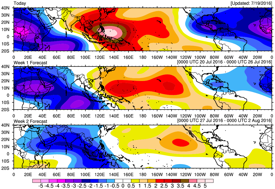 The overnight Global Ensembles are indicating a potential pattern change is possible later next week as the pesky Upper Ridge flattens and shifts West suggesting a weakness develops across the Lone Star State and the potential for a little more activity as thunderstorm complexes possibly drop SE around the Eastern flank of the Western Ridge with a weak NW flow aloft. The various ensembles also are indicating lowering pressures across the Western/Central Gulf of Mexico may well be possible and the potential exists for increasing tropical moisture in the mean Easterly flow across the Gulf as well. It is also noteworthy that the Madden Julian Oscillation is still in a favorable wet phase across our Region and that should continue into early August.