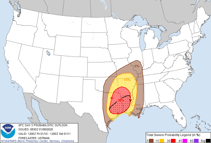 I hope everyone stays weather aware on Friday as we could see a severe weather outbreak. Its not often that you see an enhanced risk around here 3 days in advance, the SPC even has places along and north of the I-10 corridor under an hatched risk area for the possibility of significant severe weather. As the dynamics of Fridays storm look very substantial. if the trend continues i wouldn't be surprised if we got upgraded to a moderate risk.