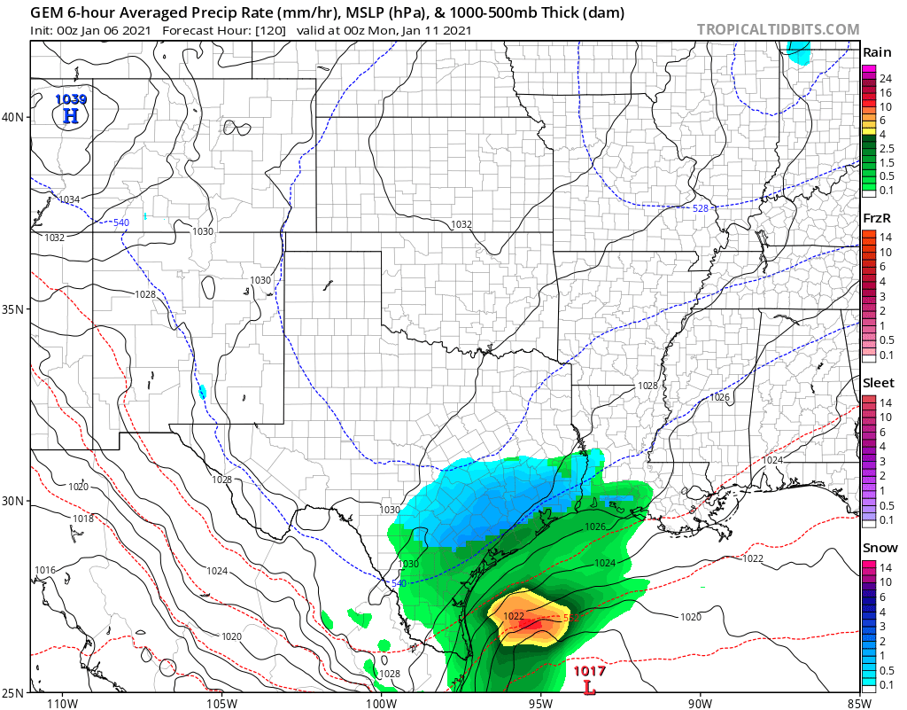 From blakes twitter: A lot of whispers about wintry precipitation this Sunday in Houston. I'm not sold. The precipitation amounts seem to be lacking, too. Really depends on the track of the low. Most models show wintry weather in Texas (with the Canadian by far the most robust). GFS/Euro not so much.