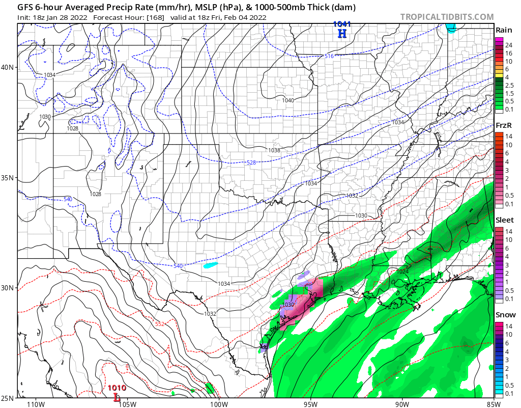 don wrote: Fri Jan 28, 2022 4:51 pm 18Z GFS shows a potent winter storm for the northern half of the state with a second piece of energy producing ice in southeast Texas on the tail end of the system. The ICON shows a similar scenario FWIW.Expect more changes in the models, but when a model such as the GFS is trending towards a storm in this range after showing nothing before, is a good sign.Let's see what the 0Z runs show.