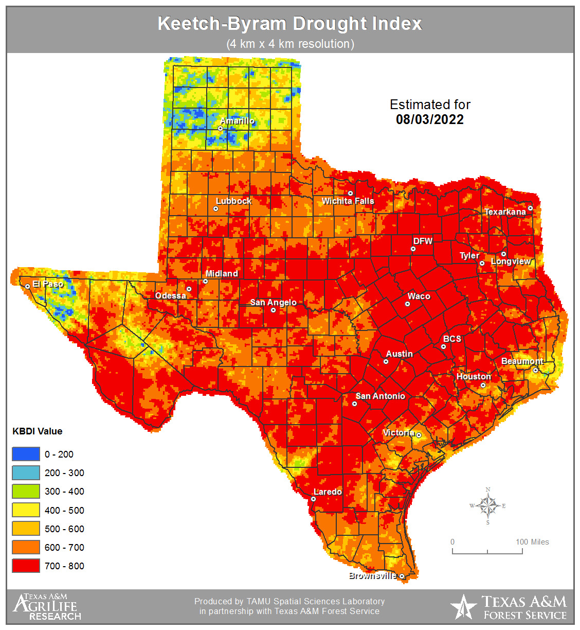 Values of 550 tend to indicate critical fire conditions and values over 700 severe. This index can also be used as a soil moisture determination with values of 100=1 inch below the soil surface is completely void of moisture. A value of 700 would indicate there is no moisture in the soil in the top 7 inches below the surface. Medium and large fuels (brush and trees) begin to exhibit stress when values exceed 600 for an extended period of time.
