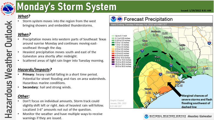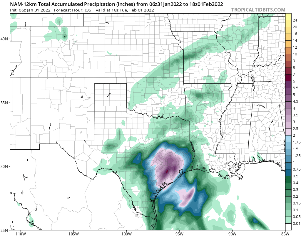 I saw the NAM and HRRR have it more focused towards Victoria.don wrote: ↑Sat Jan 29, 2022 3:07 pm Models actually trended more east today with Mondays system than yesterday when they trended west.